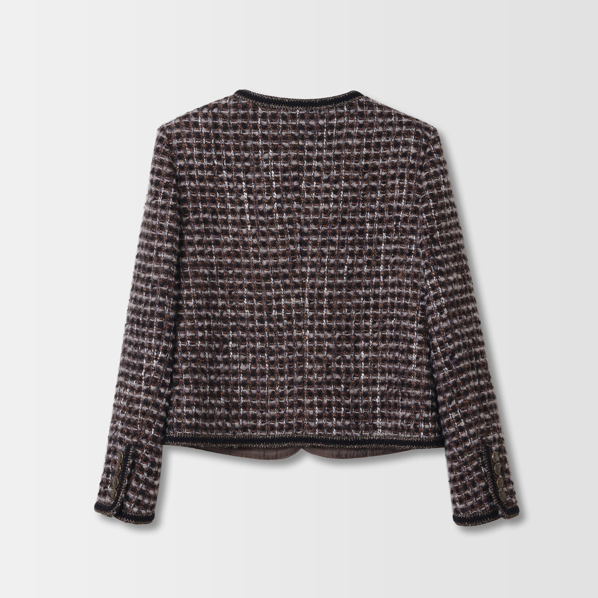 Questa giacca dal taglio dritto è realizzata in un lussuoso mix di lana, acrilico, mohair e poliestere. Presenta una classica scollatura rotonda, maniche lunghe e una chiusura frontale con bottoni gioiello. La giacca include due tasche sul petto e dettagli di rifinitura a contrasto. Il tessuto in tweed incorpora fili metallici, aggiungendo una sottile lucentezza e consistenza, e il misto cotone assicura comfort e durata.