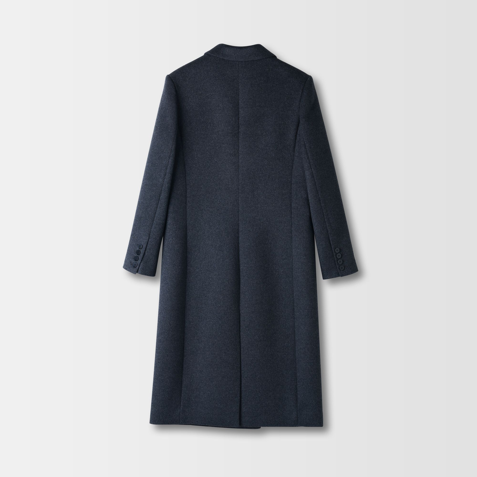Questo lungo cappotto è realizzato in fibre di lana con un tocco di cashmere, che gli conferisce una consistenza morbida e pelosa, piacevole al tatto. Il cappotto presenta una chiusura doppiopetto, revers classici, spalle morbide e una fodera completa che assicura che si sovrapponga senza sforzo alla maglieria. È progettato con due tasche laterali e una silhouette dritta su misura per una vestibilità raffinata.