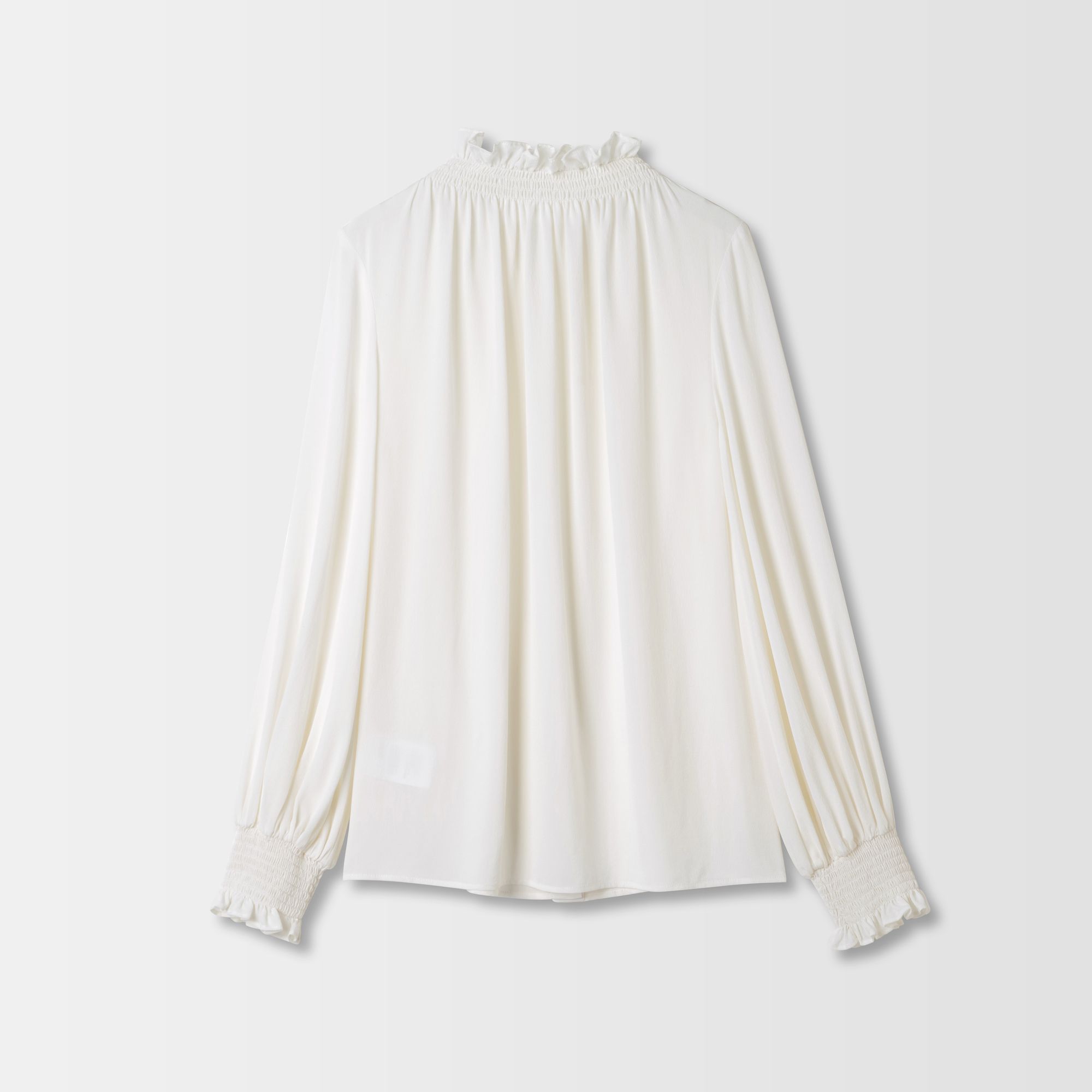 Questa camicia in pura seta è leggera e traspirante, offrendo il massimo comfort ed eleganza. La blusa bianca presenta una delicata arricciatura sullo scollo, con dettagli arricciati sia sul colletto che sui polsini. La sua silhouette leggermente voluminosa.