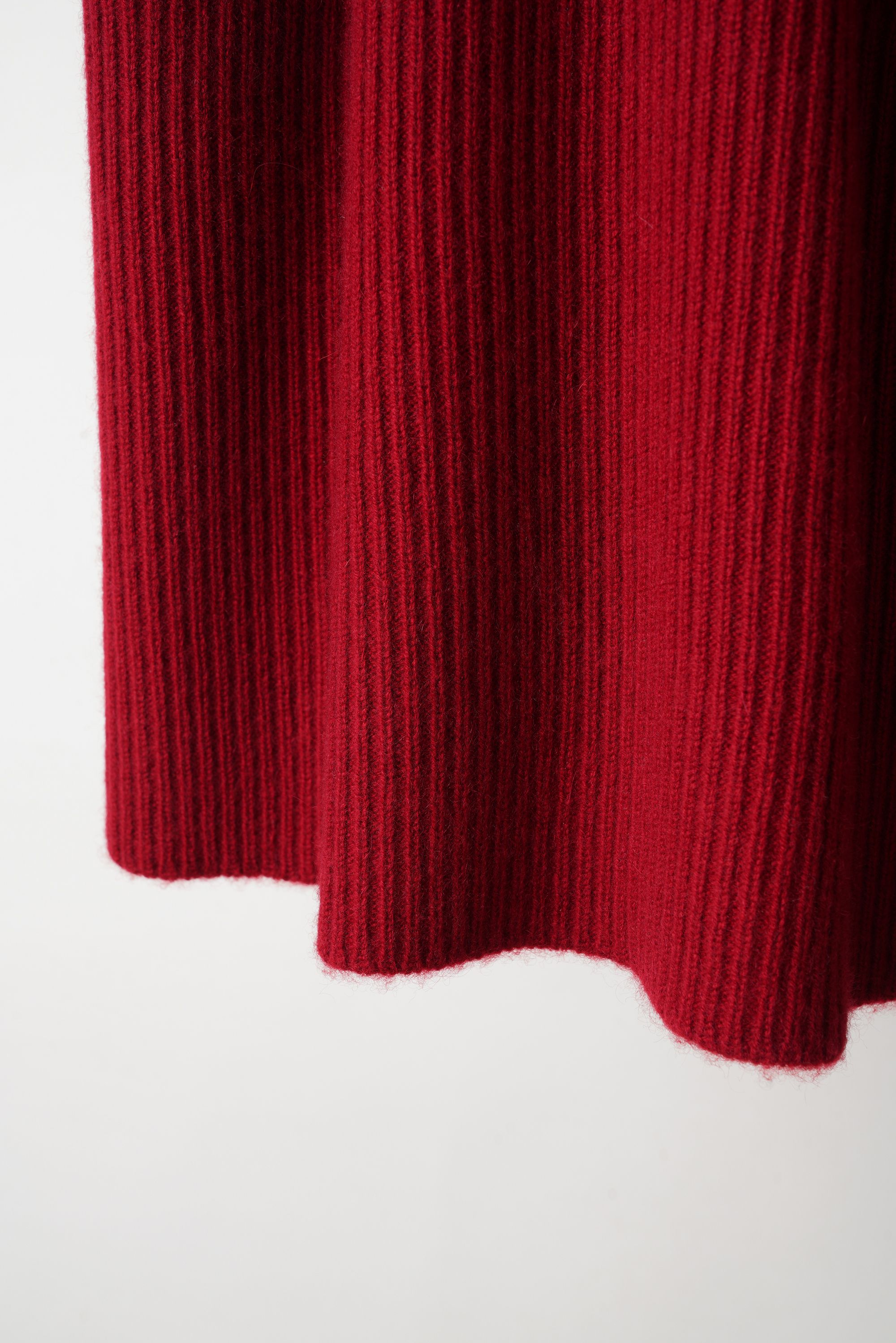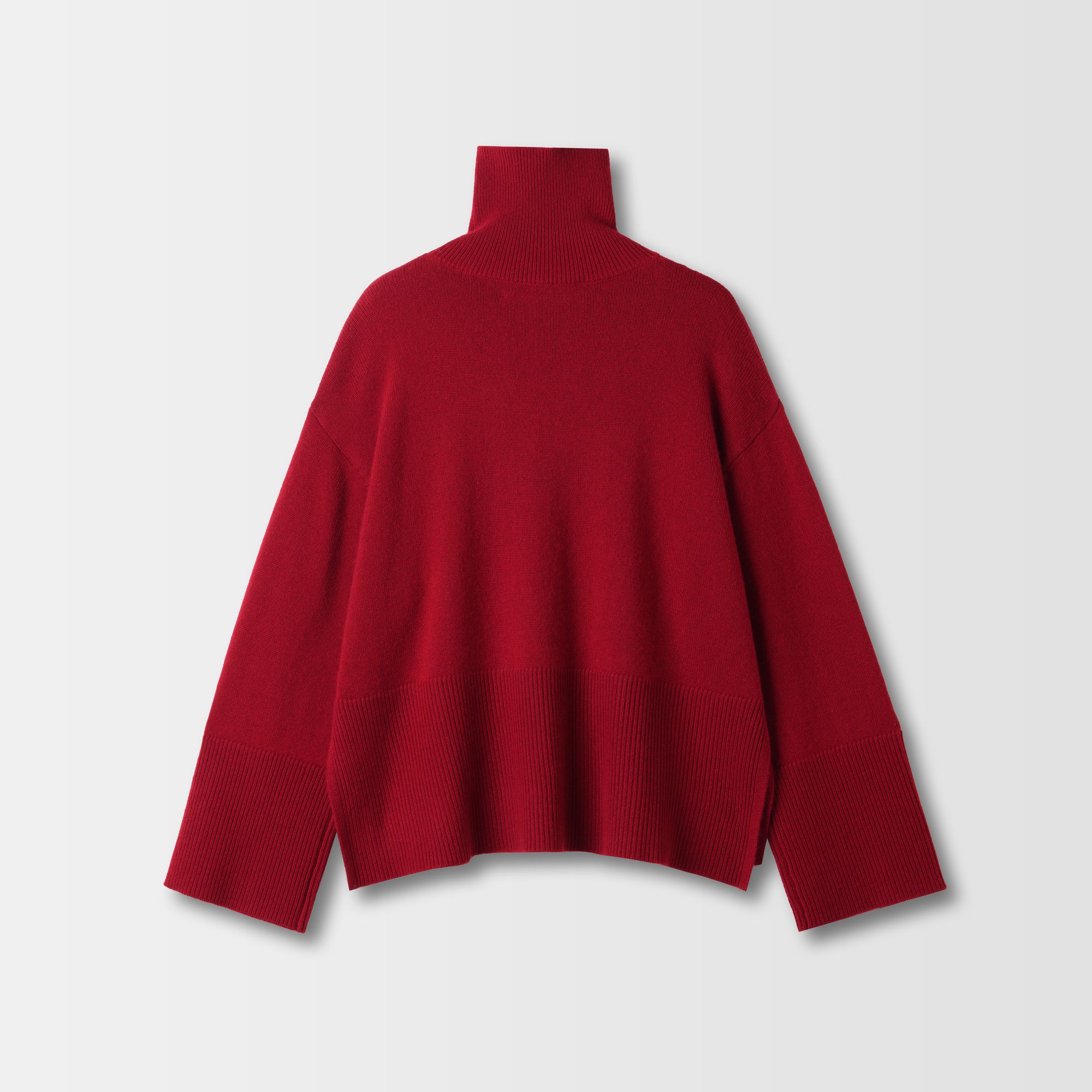 Questo maglione a collo alto, realizzato in un lussuoso misto lana e cashmere, è progettato con una vestibilità comoda e ampia. Presenta una scollatura alta, spalle scese e un orlo leggermente curvo, impreziosito da ampi dettagli a coste su colletto, polsini e orlo. Spacchi laterali discreti.