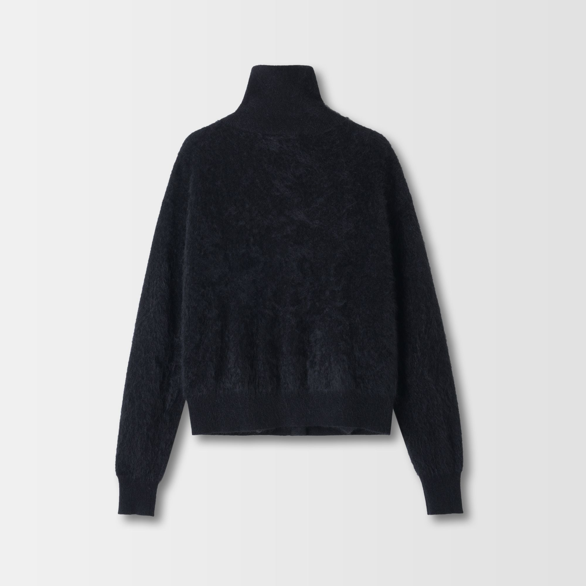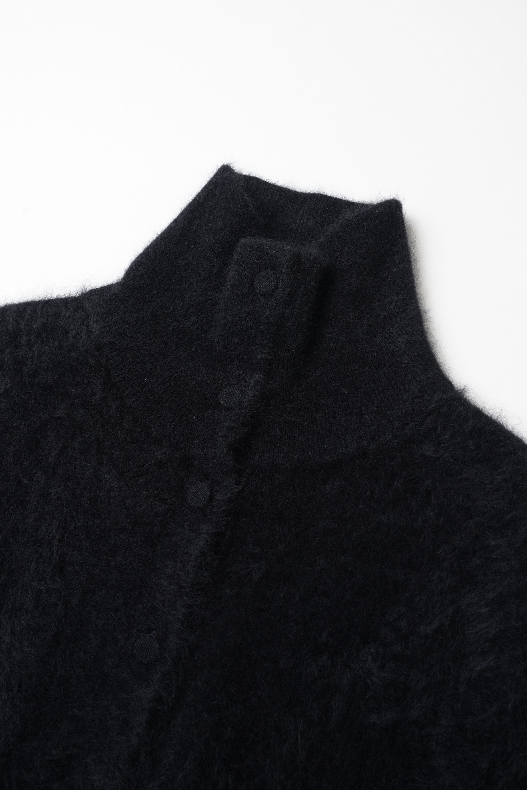 Questo cardigan a collo alto è realizzato in cashmere spazzolato ultra morbido, che offre una sensazione liscia e senza prurito sulla pelle. Con una vestibilità leggermente ampia, è perfetto per la stratificazione e può essere facilmente abbinato sia a look casual che formali. I bottoni sono realizzati nello stesso tessuto, creando una finitura raffinata ed elegante. La scollatura presenta ampie coste, mentre i polsini e l'orlo sono rifiniti con bordi a coste per una maggiore consistenza e struttura.