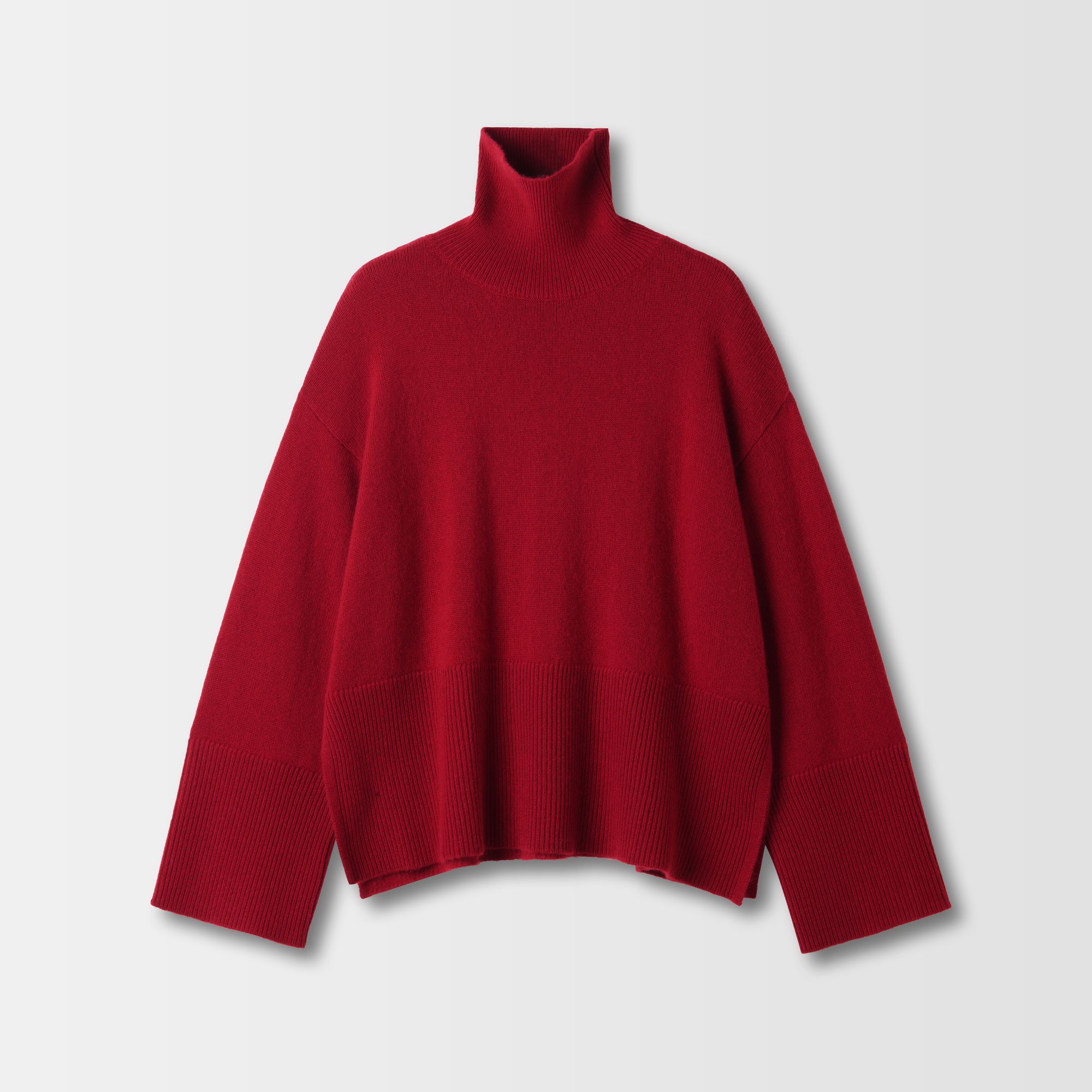 Questo maglione a collo alto, realizzato in un lussuoso misto lana e cashmere, è progettato con una vestibilità comoda e ampia. Presenta una scollatura alta, spalle scese e un orlo leggermente curvo, impreziosito da ampi dettagli a coste su colletto, polsini e orlo. Spacchi laterali discreti.