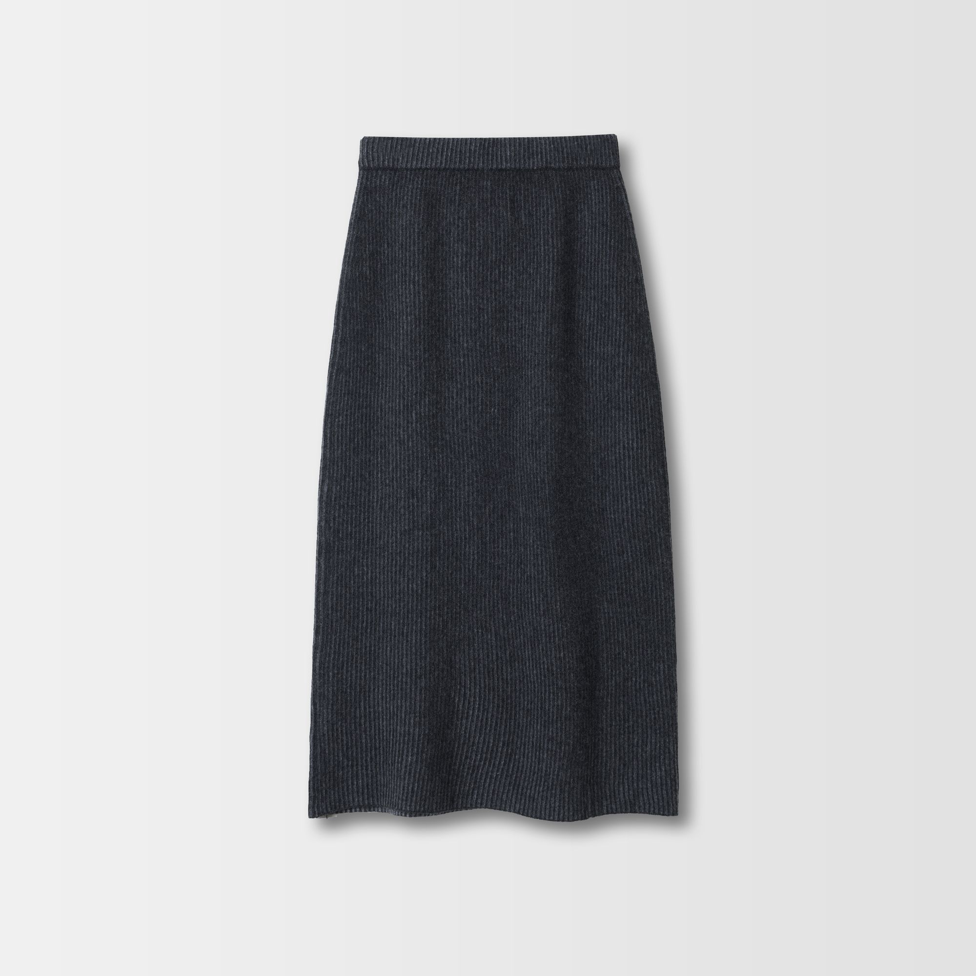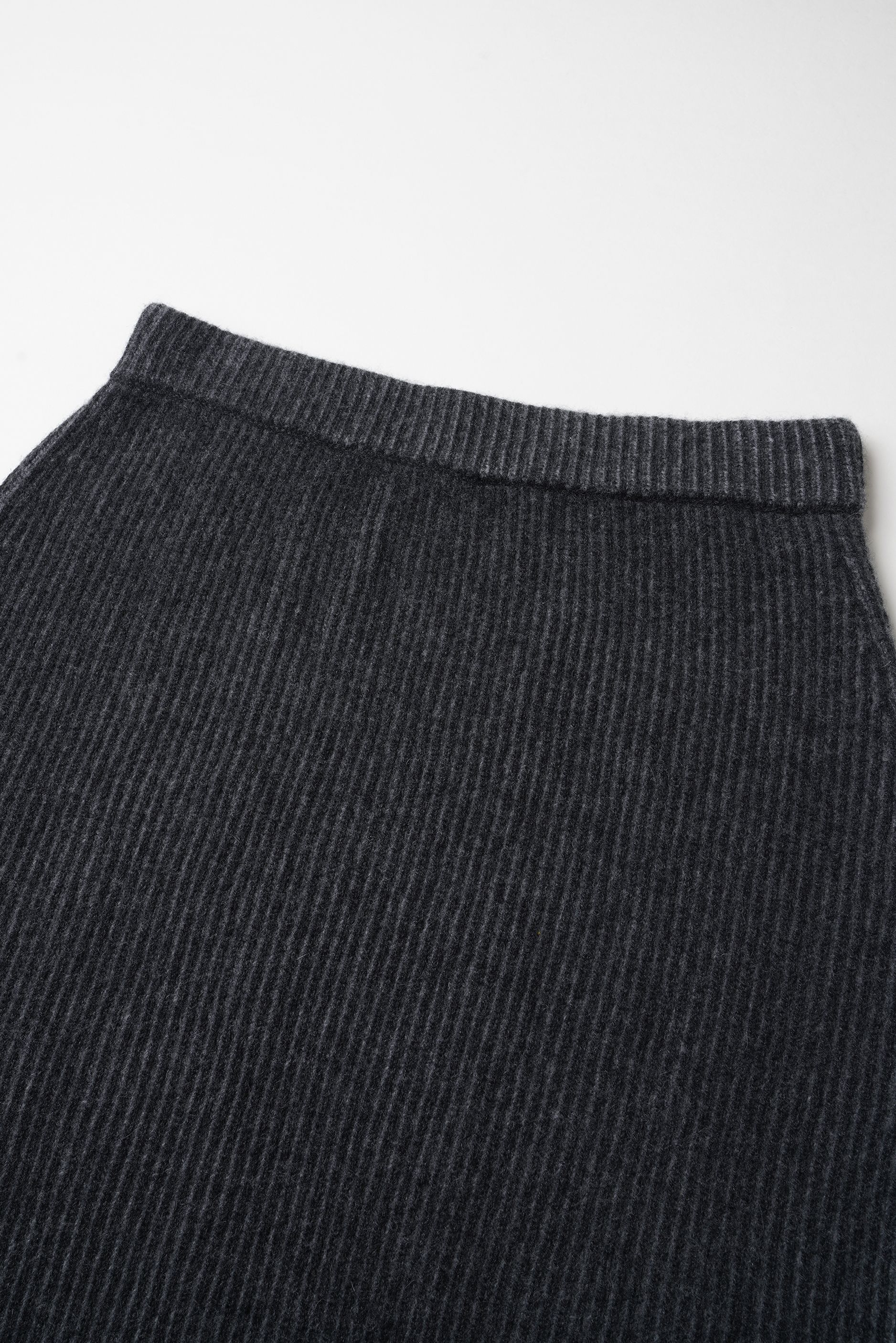 Questa raffinata gonna midi a coste è realizzata in un lussuoso misto lana e cashmere, che offre una finitura morbida e piacevole. Il taglio è leggermente svasato, offrendo una silhouette lusinghiera. Abbinala al maglione coordinato per un look chic e coerente.