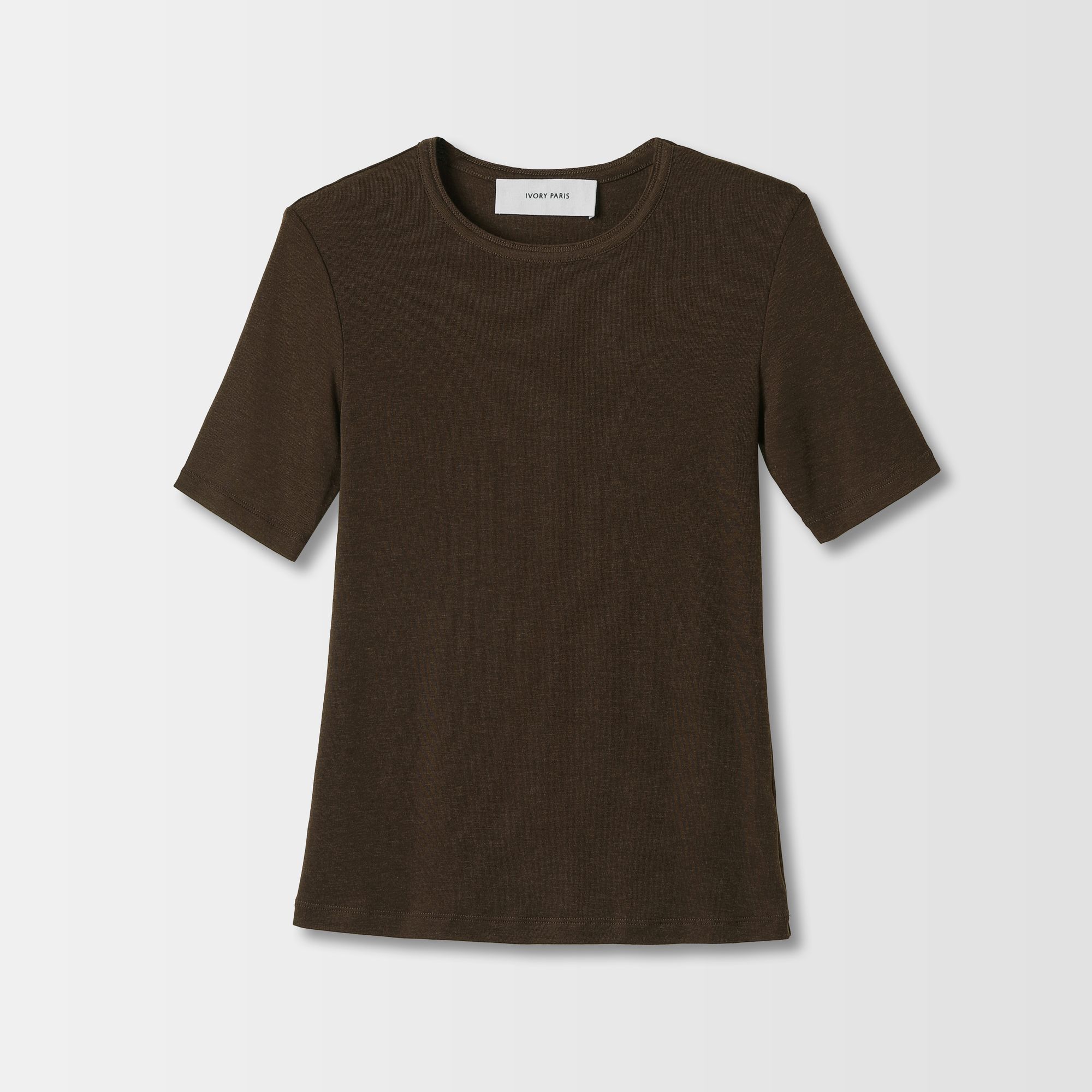 This T-shirt, crafted from a blend of Lenzing Tencel, wool, and spandex, offers a light and comfortable wear. The sleeves, which reach just above the elbows. Featuring a form-fitting silhouette and a classic round neckline, it is available in black, white, and coffee colors.